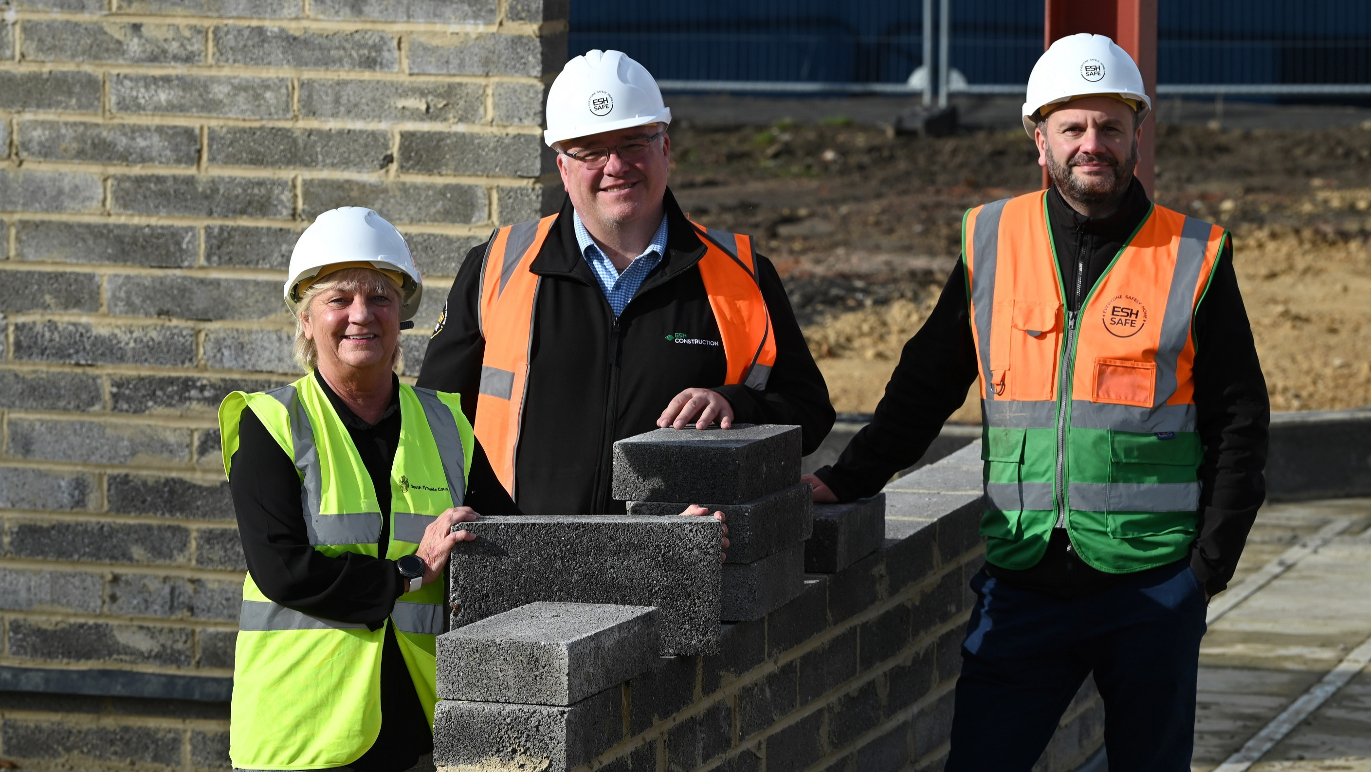 1. On site at Hebburn New Town L- R Cllr Liz McHugh Lead Member for Children, Families and Social care and Education and Skills at South Tyneside Council; Grant Watson, Construction Manager at Esh; Adam Cockburn, Site Manager at Esh
